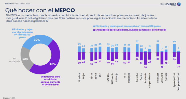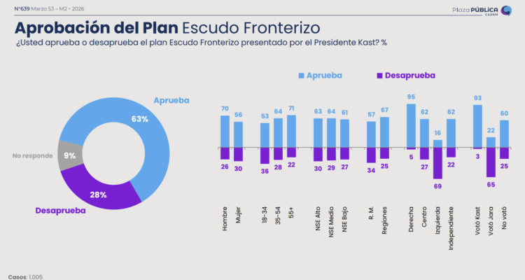 En la última Plaza Pública de Cadem, la aprobación del presidente José Antonio Kast bajó 6 puntos, situándose en un 51%, mientras que su desaprobación subió a un 42%. Respecto al MEPCO, el 48% considera que el gobierno debería endeudarse para subsidiarlo, aunque incremente el déficit fiscal, mientras que un 30% opina que el mecanismo debería eliminarse. Por otro lado, el 96% conoce el lanzamiento del Plan Escudo Fronterizo y la construcción de la zanja en el límite con Perú, acciones que cuentan con un 63% de aprobación.