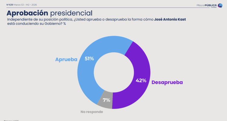 En una nueva edición de la encuesta Plaza Pública de Cadem, la aprobación al presidente José Antonio Kast registró una baja de 6 puntos respecto de su aprobación (51%). En tanto, su desaprobación alcanzó el 42% (+6 puntos).