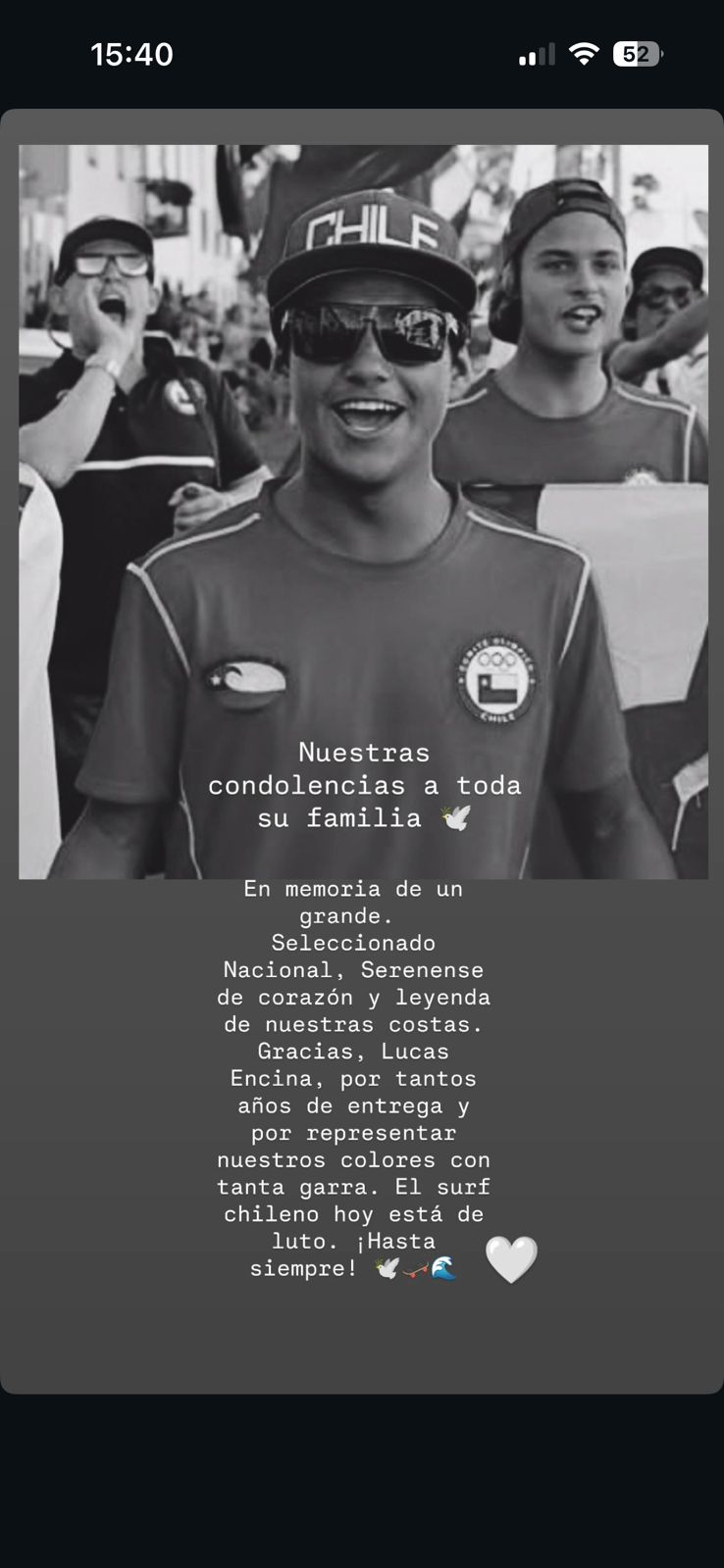 Desde la Federación Chilena de Surf lamentaron su partida a través de un emotivo mensaje. “En memoria de un grande. Seleccionado nacional, serenense de corazón y leyenda de nuestras costas. Gracias, Lucas Encina, por tantos años de entrega y por representar nuestros colores con tanta garra. El surf chileno hoy está de luto. ¡Hasta siempre!”, señalaron.