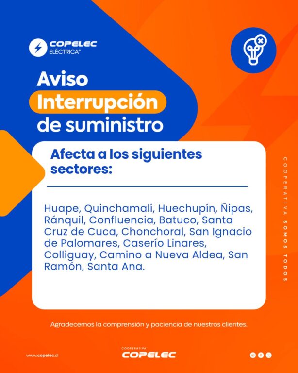De acuerdo con el comunicado, los sectores afectados corresponden a Huape, Quinchamalí, Huechupín, Ñipas, Ránquil, Confluencia, Batuco, Santa Cruz de Cuca, Chonchoral, San Ignacio de Palomares, Caserío Linares, Colliguay, Camino a Nueva Aldea, San Ramón y Santa Ana.