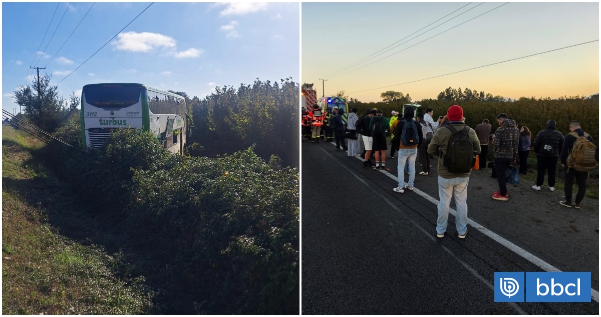 Diez personas resultaron heridas tras un accidente en la Ruta 5 Sur, sector Puente Ñiquén, región de Ñuble. Un bus de TurBus se salió de la pista, dejando lesionados leves y menos graves. La concesionaria Survías activó protocolos de emergencia, con apoyo médico y bus de reemplazo para los pasajeros. Equipos de emergencia y autoridades trabajan en el lugar, manteniendo una pista cortada de sur a norte.