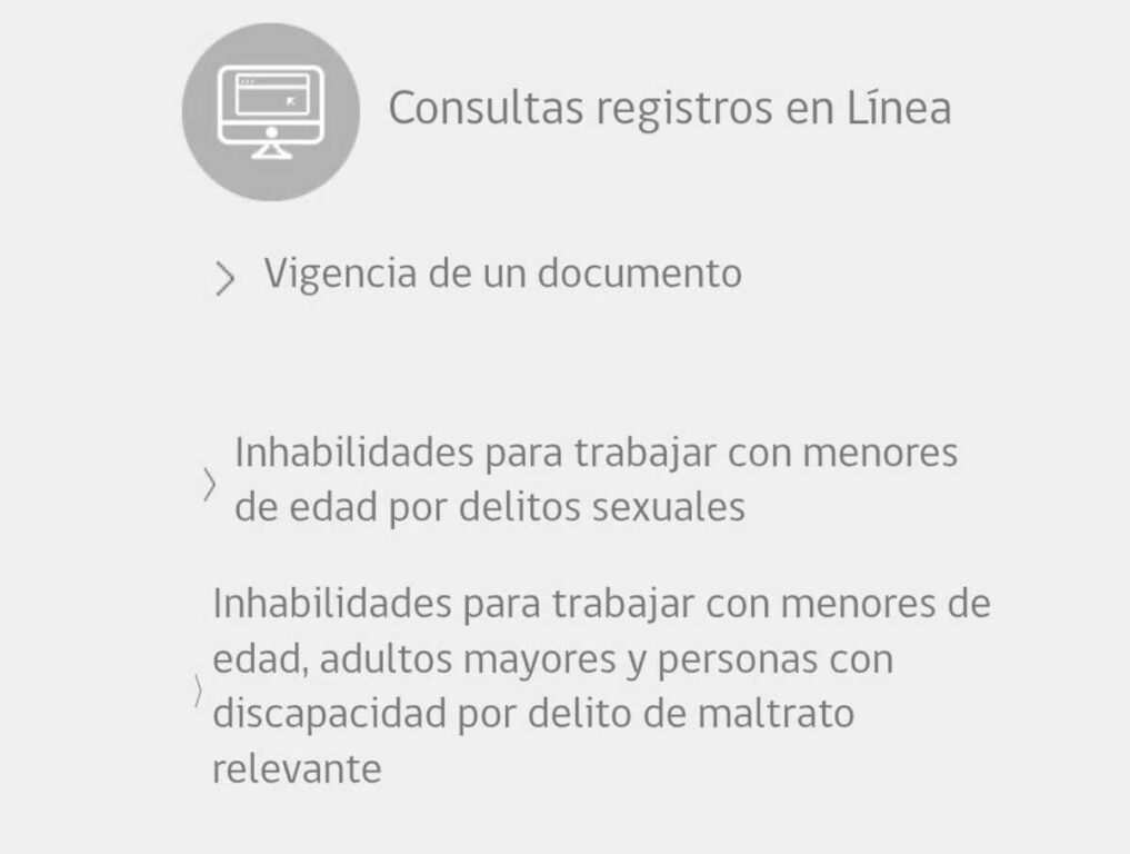 Estando en el sitio web, se debe buscar la sección “Consultas registros en línea” que aparece haciendo un pequeño movimiento hacia abajo. Allí será posible ingresar la solicitud ingresando los datos del solicitante y los del consultado (RUT, nombres y apellidos).