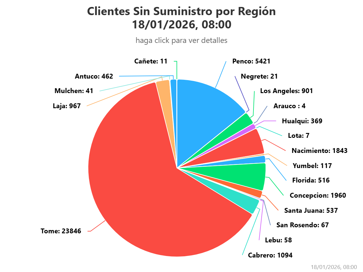 En Tomé, la cifra es de 23.846, y en Penco 5.421. Para Concepción se reportan 1.960 afectaciones de electricidad y Cabrero 1094.