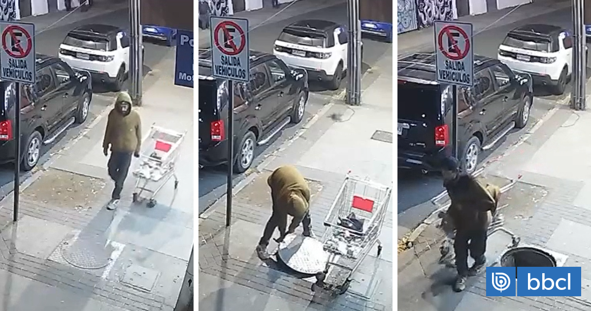 Para concretar el delito, primero se acercó con un carro de supermercado, en el que llevaba una herramienta. Con ella, logró sacar la tapa de su lugar. Luego, esperó unos momentos, mientras otras personas transitaban por la calle, para después tomar la estructura, subirla al carro y retirarse con ella cubierta por un polerón.