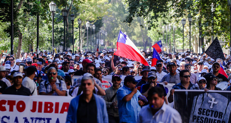 Los trabajadores de la industria pesquera iniciaron esta mañana las manifestaciones frente a La Moneda para pronunciarse en contra del veto que presentará el Gobierno, respecto de la ley que regula los aparejos de pesca para la captura de la jibia.