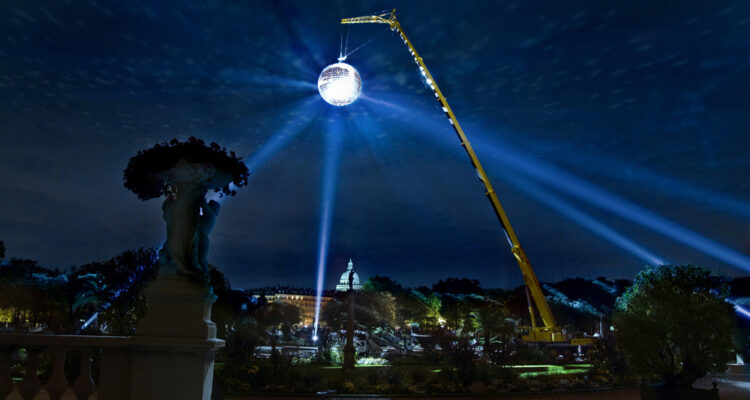 En lo alto de la ciudad y flotando sobre el suelo, una espectacular bola disco de 5 metros de diámetro, recubierta de espejos, quedará suspendida en el aire gracias a una imponente grúa, la que transformará la ciudad.