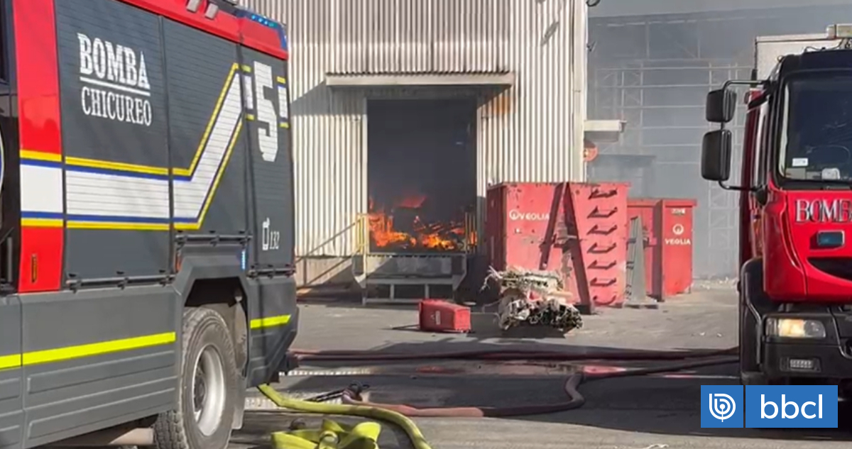 Personal de Bomberos trabajan en un incendio que se registra en una empresa ubicada en la comuna de Lampa.