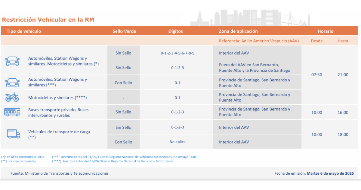 Cabe destacar que la restricción vehicular se aplica de forma permanente de lunes a viernes, excluyendo festivos. Según el Ministerio de Transportes y Telecomunicaciones, la restricción afecta a móviles con y sin Sello Verde, con variaciones según zonas y horarios.