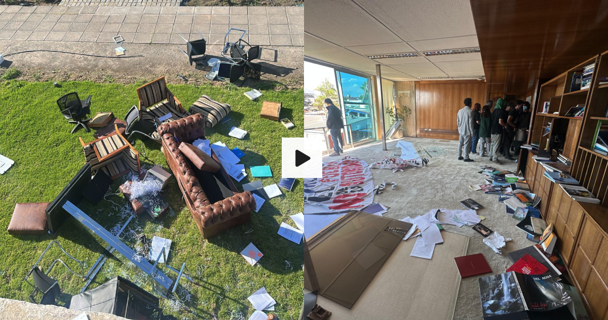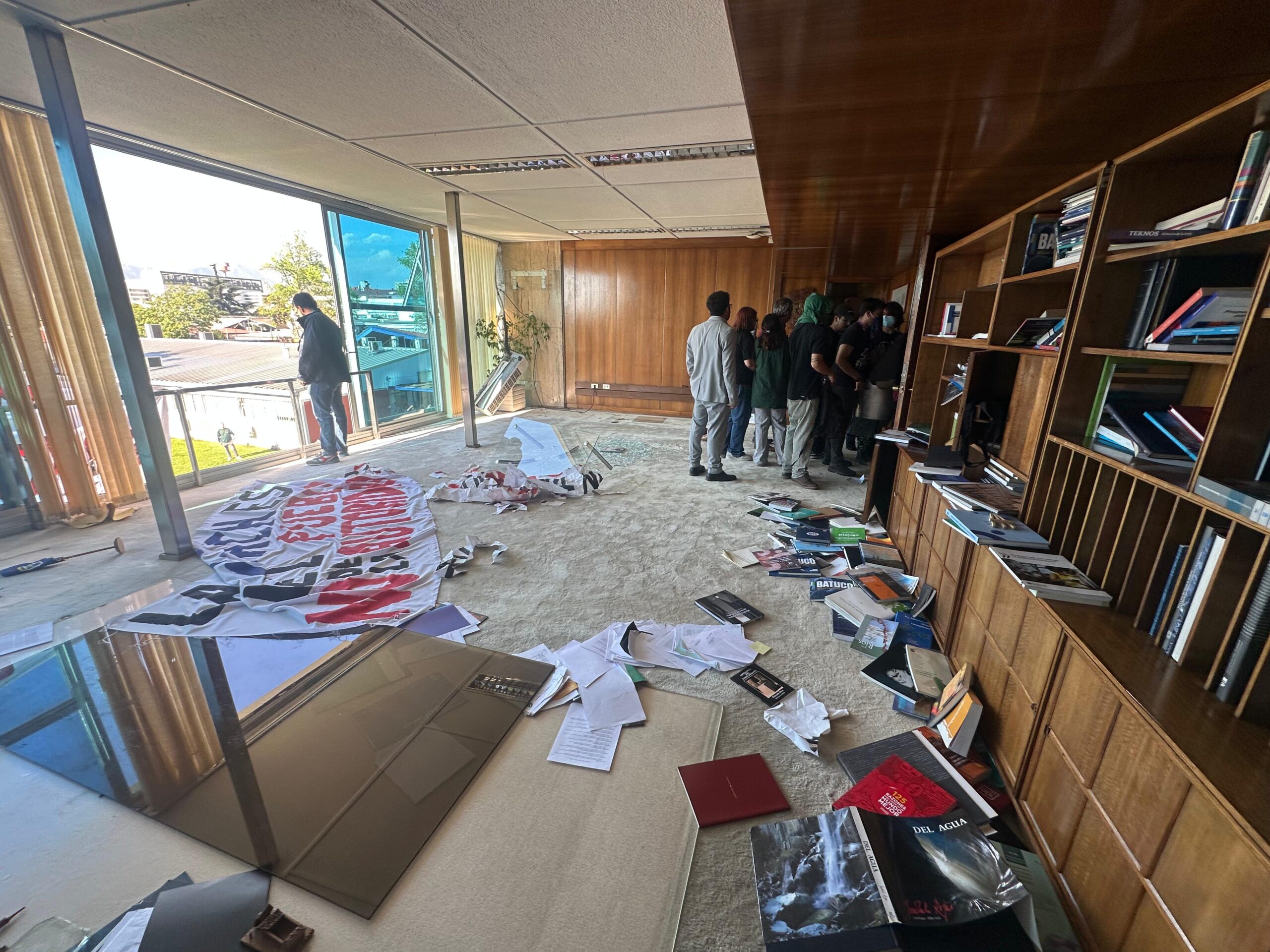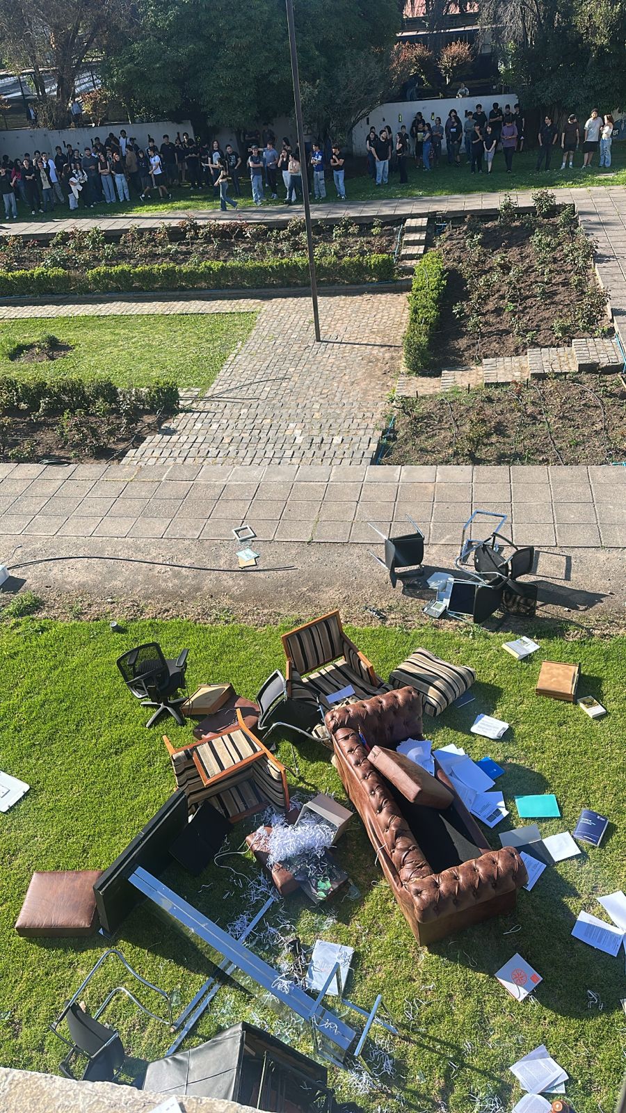 Destrozos en oficina del rector de la Usach | CedidaObjetos de la oficina del rector de la Usach en el exterior | CedidaConvocatoria a movilización interna | IG Feusach