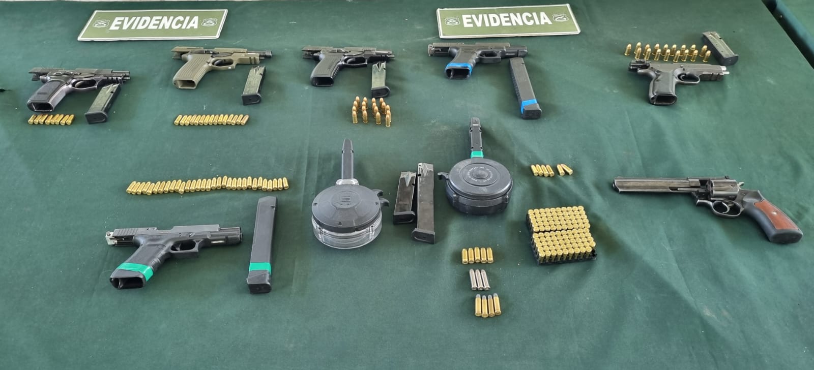 En el procedimiento se incautaron seis armas de fuego tipo pistola y un revólver. Entre ellas, tres pistolas marca Bersa 9 mm con número de serie borrado; una pistola Glock 9 mm, serie BEGL935; una pistola Tanfoglio 9 mm; otra pistola Glock 9 mm con número de serie borrado; y un revólver Ruger calibre .38.