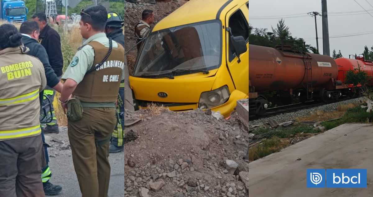 Un tren de carga de ácido sulfúrico colisiona con un furgón en Buin, región Metropolitana, resultando al menos cuatro personas lesionadas de nacionalidad boliviana, cuyo diagnóstico se mantiene reservado. A pesar de no presentar riesgo vital, fueron trasladadas a centros asistenciales. El tránsito en el cruce de avenida Viluco con Camino Campusano está suspendido. Se descarta la presencia de escolares en el furgón. Carabineros investiga el accidente, donde se informa que el furgón no habría respetado el signo pare en el cruce.
