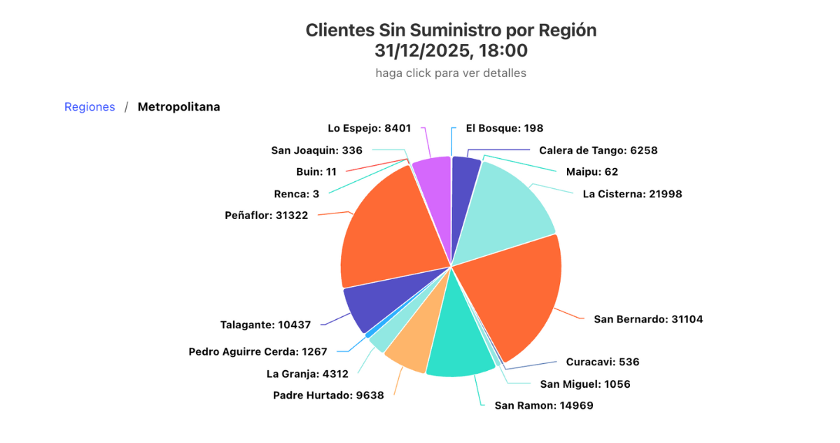Hasta las 18:00 horas, algunas de las zonas más afectadas fueron Peñaflor, con más de 31 mil clientes sin luz; San Bernardo, con más de 31 mil usuarios; La Cisterna, con más de 21 mil personas; y San Ramón, con más de 14 mil.