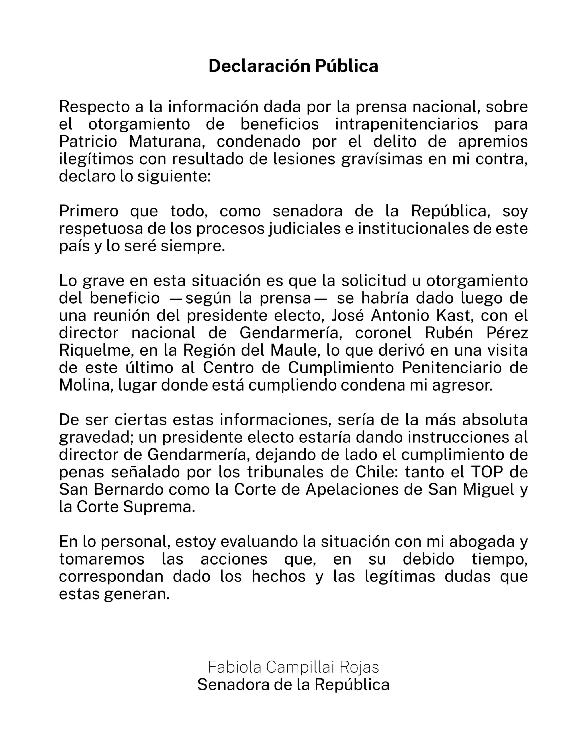 “De ser ciertas estas informaciones, sería de la más absoluta gravedad: un presidente electo estaría dando instrucciones al director de Gendarmería, dejando de lado el cumplimiento de penas señalado por tribunales de Chile: tanto el TOP de San Bernardo como la Corte de Apelaciones de San Miguel y la Corte Suprema“, expresó la parlamentaria.
