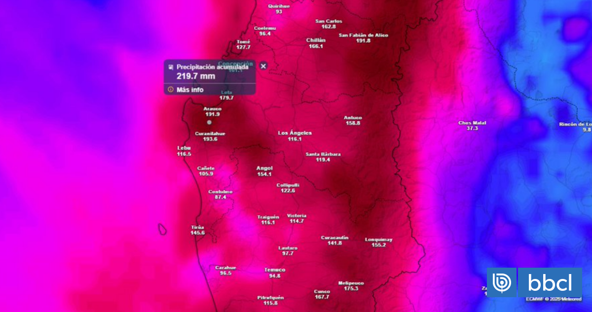El meteorólogo de la Dirección Meteorológica de Chile, Andrés Moncada, informó que “las lluvias se han concentrado desde la región del Bío Bío hasta la región de Los Lagos” en este comienzo de semana, “con acumulados de hasta 150 mm en la cordillera de este tramo”.