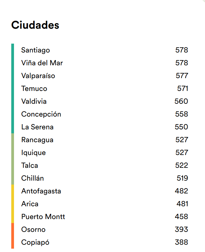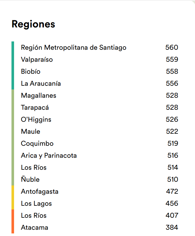La región Metropolitana vuelve a liderar el país con 560 puntos, seguida por Valparaíso (559) y Bío Bío (558). En el extremo opuesto aparecen Atacama (384) y Los Lagos (456).