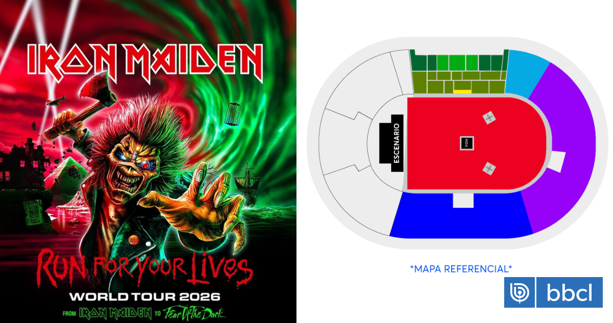 La preventa de entradas para el concierto de Iron Maiden en Chile, el 31 de octubre de 2026, inicia el 16 de diciembre a las 11:00 hrs. con un 20% de descuento para clientes Entel o con tarjeta Santander. Los precios van desde $46.600 (galería) hasta $186.400 (Pacífico Medio). La venta general empieza el 18 de diciembre. La gira Run For Your Lives World Tour celebra los 50 años de la banda británica y visitará países de la región.